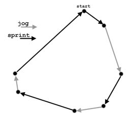 Entrenamiento: correr a gran velocidad de los puntos 1 al 6 y luego regresar a 1. Descanse en cada punto por un periodo de tiempo dado. Usted puede cambiar los valores en el diagrama, pero esto debe ser hecho proporcionalmente. Repita de 5 a 10 veces.