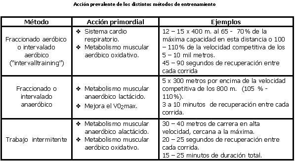 El “entrenamiento de intervalos” está orientado hacia las especialidades aeróbicas, como las carreras de 1500 metros hasta la maratón. Estas cargas de trabajo deben ser realizadas dentro de cierto margen de intensidad, las cuales designamos actualmente como “fraccionado o intervalado aeróbico”. Por su magnitud en la unidad de tiempo, compromete de manera prevalente el mecanismo oxidativo, es decir, la producción de energía desde fuente mitocondrial, e inclusive, efectuándose hasta el límite del comienzo del mecanismo prevalentemente anaeróbico, posibilita el incremento del VO2 max. Pero estas mismas distancias, recorridas a mayor intensidad, por encima del VO2 max. -110 a 120% de dicho parámetro y dependiendo del trecho fraccionado- ya dejan de impactar con tanto énfasis sobre esta área celular y lo hacen en la esfera citoplasmática, extra -mitocondrial, es decir, sobre el mecanismo glucolítico – anaeróbico – lactácido (Keul, 1989; Hollmann, 1990). Esta es la “piedra de toque” para la velocidad prolongada como ser 200, 400, 800 metros para el atletismo, 50, 100 y 200 en la natación. Esto constituye el Entrenamiento Fraccionado o Intervalado Anaeróbico. De acuerdo a lo expuesto, el Entrenamiento Fraccionado consiste en fraccionar las distancias competitivas con cargas o intensidades que estén íntimamente vinculadas con el ritmo de carrera, con las posibilidades del deportista o atleta para determinada distancia, con márgenes porcentuales de velocidad que se concretan sobre el ámbito aeróbico para los fondistas y el anaeróbico en la velocidad prolongada: ¡aún con las mismas distancias fraccionadas! (“De la aeróbico a lo anaeróbico” www.efdeportes.com).