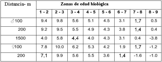 Tabla 3. Incremento de los resultados deportivos en diferentes zonas de desarrollo puberal (%).