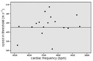 En la Tabla 4 se verifica la correlación entre las velocidades alcanzadas en las pruebas propuestas. Estas velocidades se correlacionan; presentando la Vcrit una mayor correlación en relación con la velocidad del VO2max que al compararla con la velocidad del umbral anaeróbico (AT). El gráfico 6 muestra la comparación entre las velocidades alcanzadas en las tres pruebas del estudio, donde no se encontraron diferencias significativas.