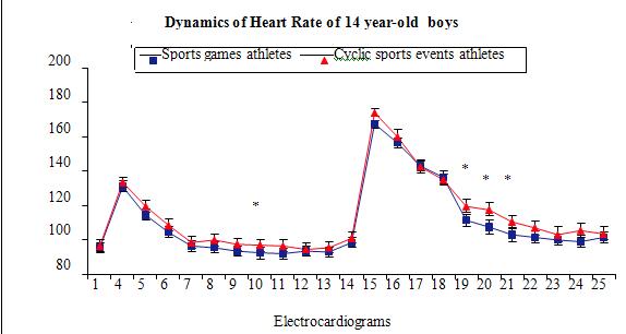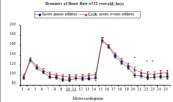 1 ECG –antes de la carga; 4-14 ECG –recuperación después del test de Rouffier; 15-25 ECG – recuperación después de la prueba de salto máximo de 30s.
