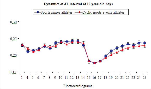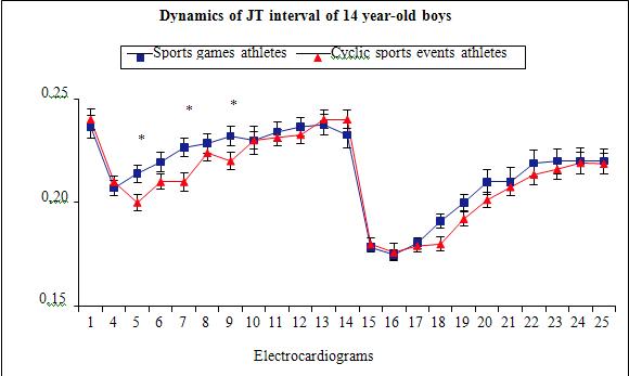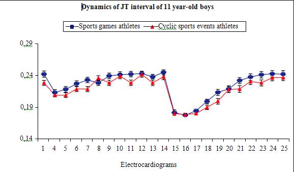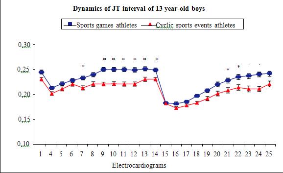 Existe una tendencia hacia la reducción de la FC en reposo mientras que, durante el desempeño de cargas de trabajo dosificadas y extenuantes, la FC disminuye considerablemente; pero la tasa de recuperación de la mayoría de los índices de ECG y PA aumenta. Los resultados sobre las funciones de la FC indicaron que no se percibieron diferencias en los índices de PA entre los atletas de juegos deportivos y los de eventos cíclicos. El primer grupo se caracterizó por tener valores de FC inferiores a los del segundo, aunque durante toda la investigación se observaron diferencias estadísticas significativas en el grupo de 13 años de edad (Fig. 2) y al evaluar el intervalo de datos JT (Fig. 3).