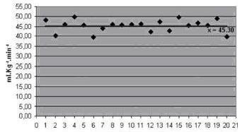 El VO2max es proporcional al peso corporal 2 . Los valores por encima de 70 ml.kg-1.min-1 2 se consideran favorables para lograr un buen rendimiento en competencias de resistencia; los valores por debajo de 60 ml.kg-1.min-1 indican incapacidad para la competición internacional. En personas normales no entrenadas entre 25 y 30 años de edad se observan valores de 45 ml.kg-1.min-1 2.