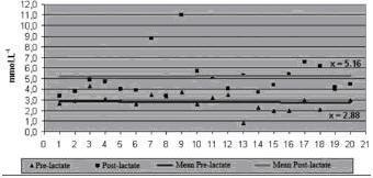 En el gráfico 4 se aprecia la variación del pre lactato, cuyo valor máximo fue de 4.3 mmol.L-1 alcanzado por las Atletas 03 y 19, y el mínimo de 0.8 mmol. L-1, alcanzado por la Atleta 13. En cuanto al post lactato, el valor máximo fue de 11.0 mmol. L-1 , alcanzado por la Atleta 09, y el mínimo de 3.4 mmol. L-1 obtenido por las Atletas 01 y 08. Es pertinente insistir en que este valor podría haber sido hallado por error durante el proceso de recogida de datos.