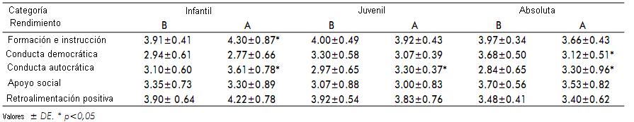 La comparación de las diferentes sub-escalas de LSS entre los niveles de rendimiento (Tabla 1) aparece que en las tres categorías del grupo A la mayor puntuación se alcanzó en la conducta autocrática del entrenador en comparación con el grupo B; mientras que la conducta democrática persigue un comportamiento inverso. La sub-escala de formación e instrucción muestra mayor puntuación en el grupo A para la categoría infantil, y se invierte esta situación en las categorías juvenil y absoluta.