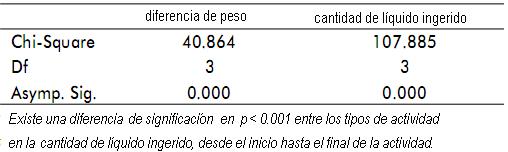 Tabla 2. Resultados de la prueba de Kruskal Wallis sobre el tipo de actividad de la variable independiente para la pérdida de peso y la ingestión de líquidos desde el inicio hasta el final de las actividades.