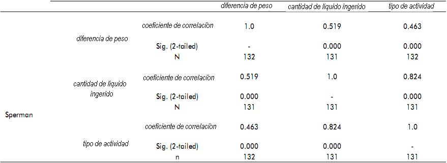 Tabla 3. Correlación entre la diferencia de peso, cantidad de líquido ingerido y tipo de actividad.